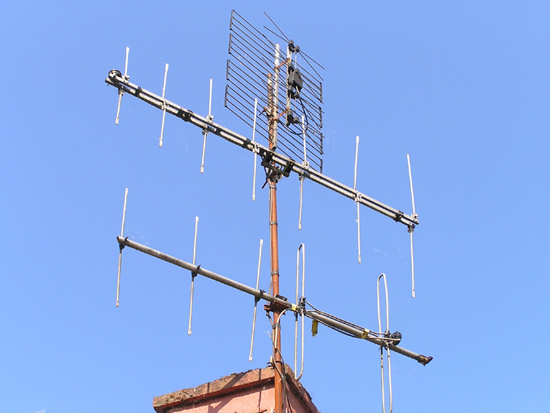 The lower aerial is a wideband type based on the yagi design but with two dipoles. This arrangement is intended to reduce pick-up from the rear, and can also increase bandwidth. This example originally had two reflectors mounted on a rear cross arm.