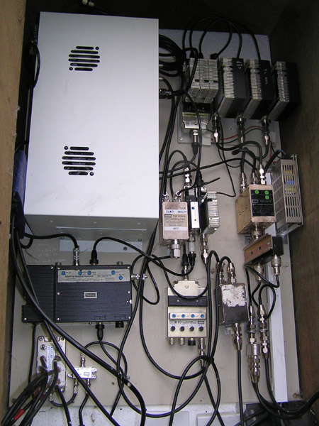 These pictures show a small relay station, privately owned and operated. The location is well out west, far from UK TV signals, so the inputs are simply two UHF and two VHF channels from the local main station. All four are transmitted at UHF.