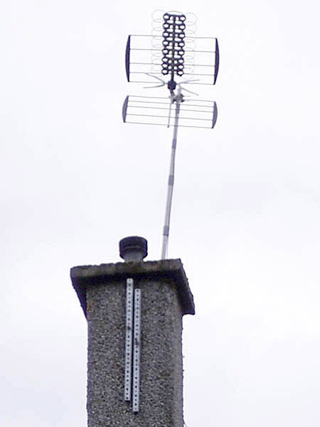 Thanks to Geo (whoever you are) for this shot. Geo obviously couldn’t get to the other side of the building, but I think we can figure this out anyway. The bolts holding the aerial are through the stack, and it looks as if they penetrate the gas flue.