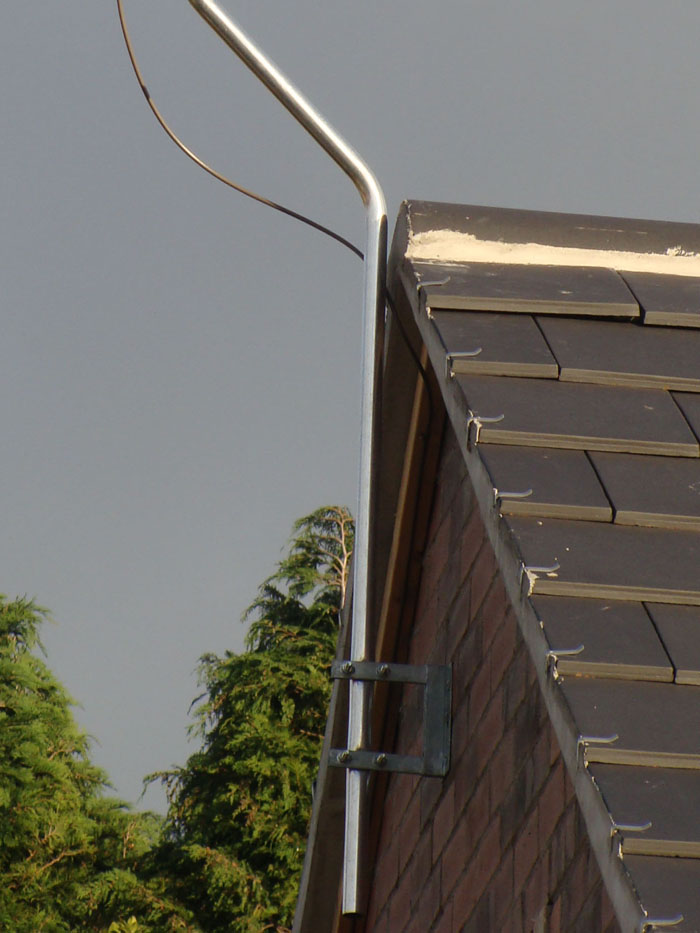 This is a common DIY mistake. The thin cranked masts that the DIY sheds sell are quite flexible. This mast will tap on the masonry when the wind blows. Note also the unsecured cable and the untidy bit of mast hanging down.
