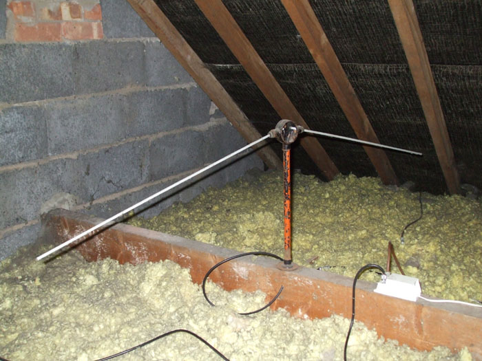 Made forty years ago, this FM dipole had elements made from aluminium rod and a junction box made from a conduit inspection box. The rubber grommets used to hold the elements have perished; hence the sag. This aerial provided good service for many years.
