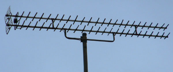 Two 26 element yagis with a common driven element. The use of two standard contract-type flatplate reflectors, jammed one above the other, rather spoils the design. If anyone has any information about this type of aerial please let me know.