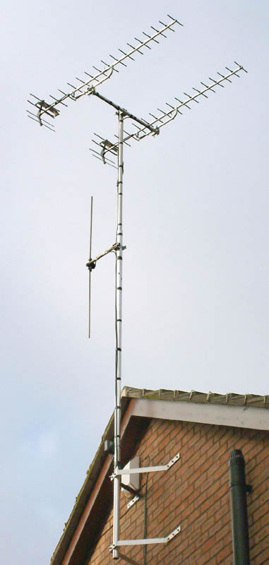 A pair of Antiference TC18A arrays stacked to achieve good gain and directivity. The vertical dipole is for VHF FM radio, and is much better than the more common halo.