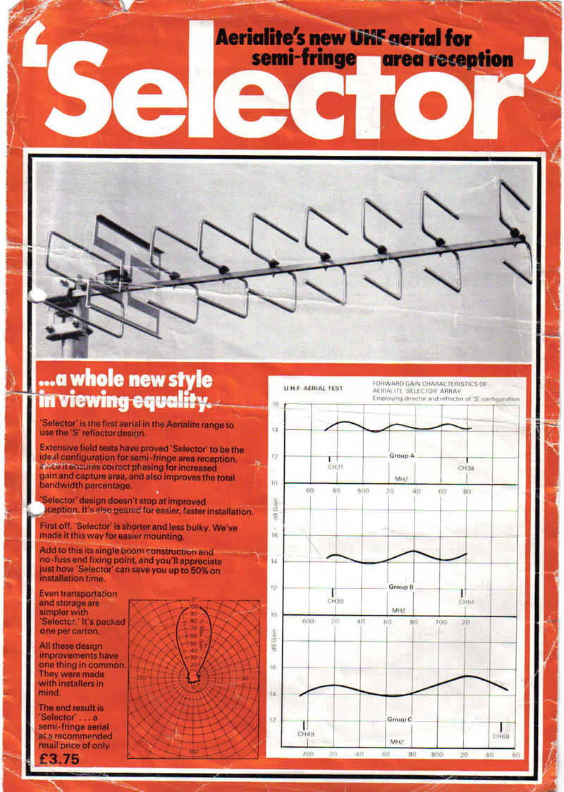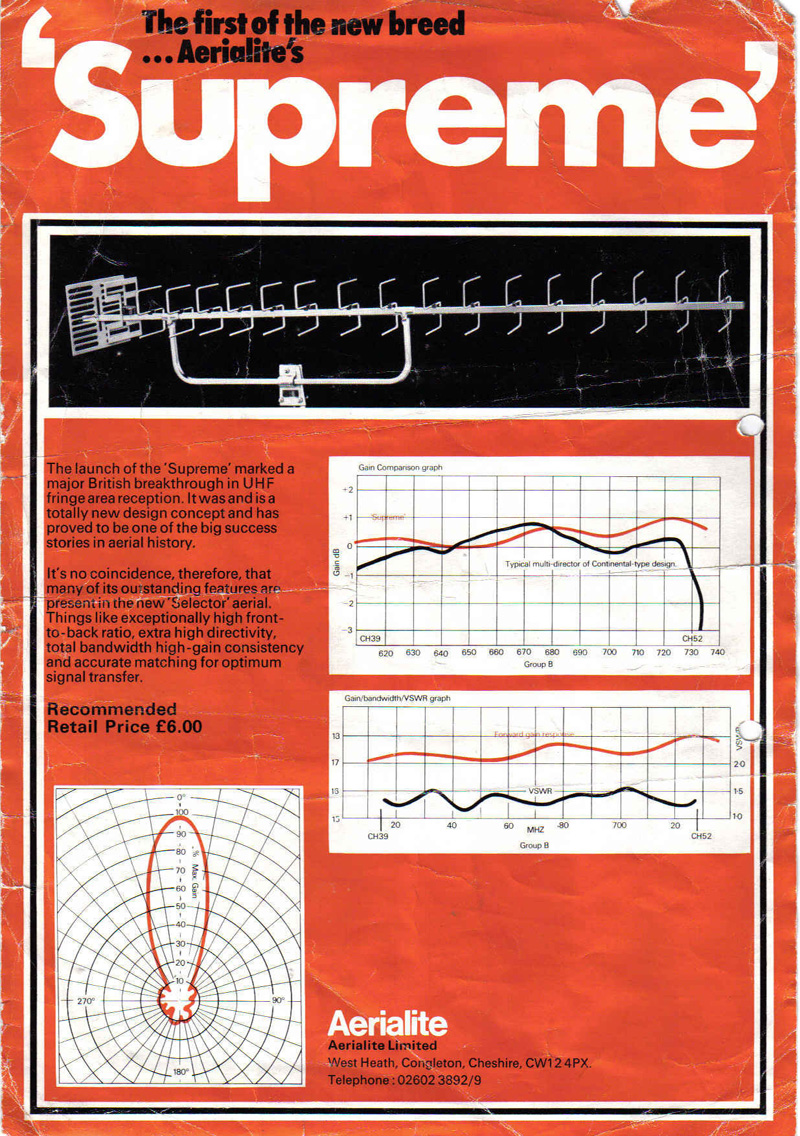 Aerialite, of Stalybridge, Cheshire, made TV and radio aerials from well before the war until 1981, when the aerial side of the business was sold to Antiference.The aerials were well-made, and some of the ones I installed almost forty years ago are still up there doing their job. The Selector and Supreme were part of the high gain range. Click here for a picture of a Supreme of much later vintage.