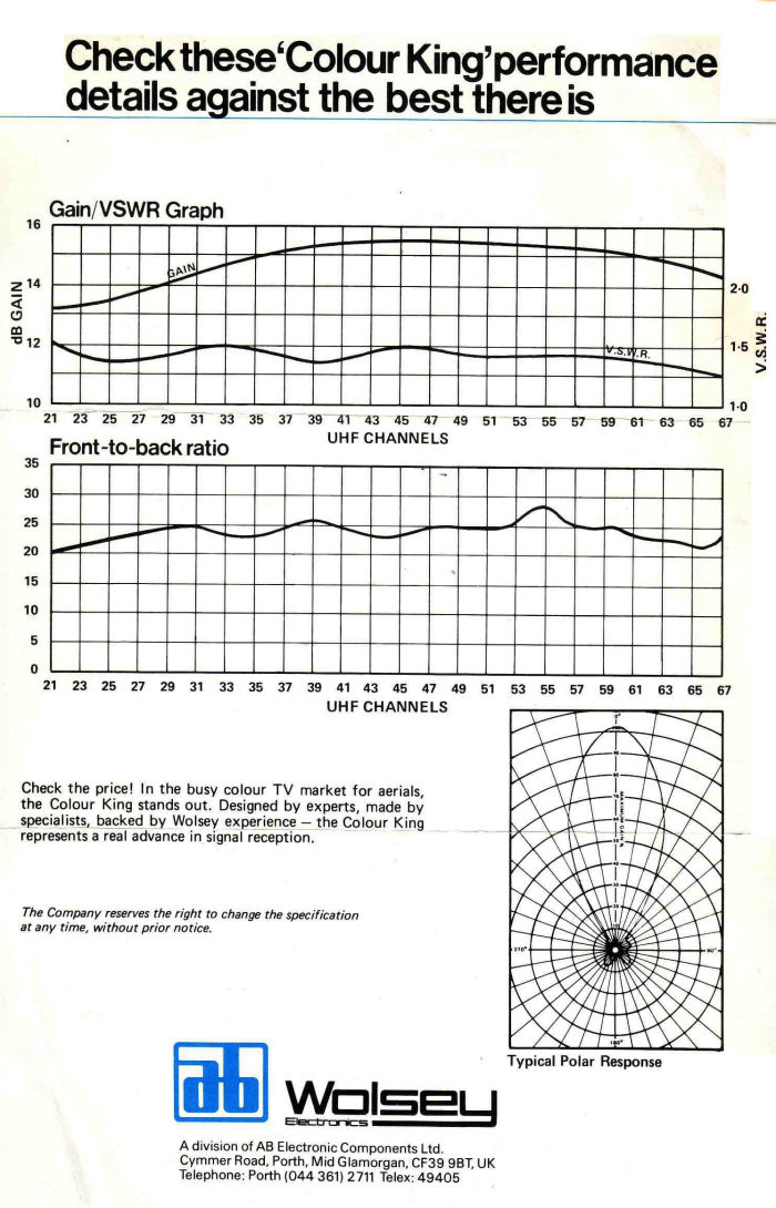 I think Wolsey might have been the first UK manufacturer to bring out a ‘billboard’ or ‘fireguard’ UHF aerial. This is an inherently wideband design, but most makes seem to peak in Group B. Although useful for mounting with their back to the wall in places where an aerial that sticks out would look bad (I’ve seen them hidden amongst ivy), the general feeling in the trade is that this design is not quite all it’s cracked up to be. These aerials have never been massively popular, although a few people seem to love them, and sometimes when travelling you might see hundreds of them in one small area. When used for vertical polarisation this design can perform impressively when multipath or co-channel interference is a problem. They are not at all good in this respect when used for horizontal polarisation, but apparently can be helpful when tidal fading is a problem. Most makes have the disadvantage that the gain falls off badly at the very top of the band, and curiously the graphs shown here don’t include channel 68 . . . Thanks to Roger Piper for this contribution.