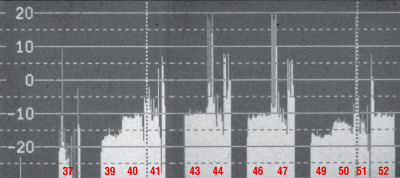 You can see how the 4kW muxes are significantly lower than the rest, which are 10kW. The analogue video carriers are all about 870kW, which comes out at about 20dB above the muxes. You can’t see the ones on channels 41 and 51 very well because I carelessly left markers over them. This screenshot was taken with the analyser storing the maximum levels for about a minute, and this does tend to exaggerate analogue carriers by about 8dB.
