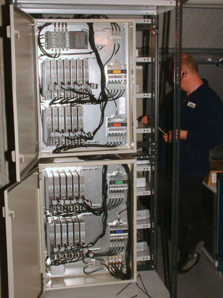 This is part of a head end that provided five off-air analogue channels, six off-air DTT muxes, and 21 in-house channels. The items you see here are the 21 VSB modulators and the channel filter levellers that handle their outputs. Filters were used rather than the manufacturer’s recommended method of using ‘U’ links because the large number of channels and general standard of the installation needed the modulators’ (already very slight) out-of-channel noise to be eliminated as far as possible.