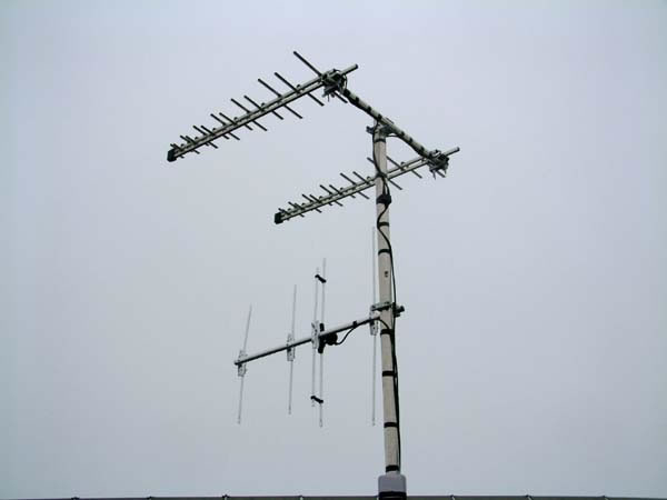 This was installed in 2007, in the English north midlands. We tried Emley Moor, but Sutton Coldfield caused intolerable co-channel interference. We tried Sutton Coldfield but Emley Moor caused intolerable co-channel interference. It was good planning for the two adjacent transmitters to re-use the same channels for DTT and analogue, don’t you think? We tried Waltham and got nowt because there was a big hill in the way. We went away and did the sums and returned with this array of two log periodics. The inter-aerial spacing was calculated so that the array would reject signals from the relevant angle. This was optimised for the middle of Group B. The array provided reliable Sutton Coldfield reception, which was quite a good result really because when we first erected an aerial the results were pretty dismal.