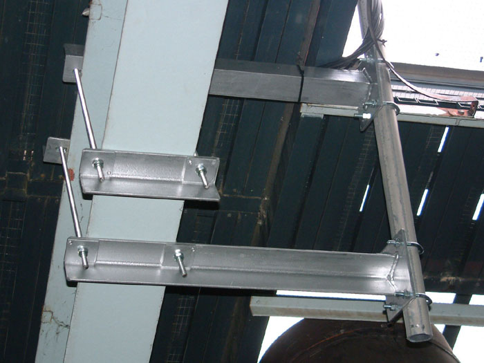 Specially made bracket set to support a dish. The support had to be very strong and rigid. This solution was considerably more trouble than simply concocting something from Dexion or whatever, but structurally far superior and also much more elegant! I do like something that looks the business. Thanks to Rossington Light Engineering.