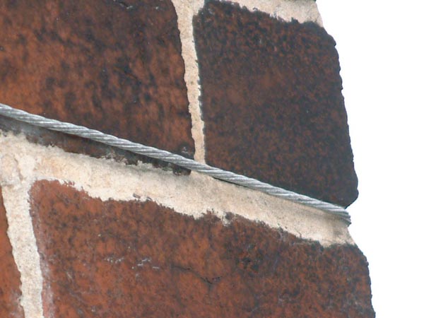 The lashing wire goes around the chimney and it has to be really tight. Corner plates must be used or the wire can damage the masonry.