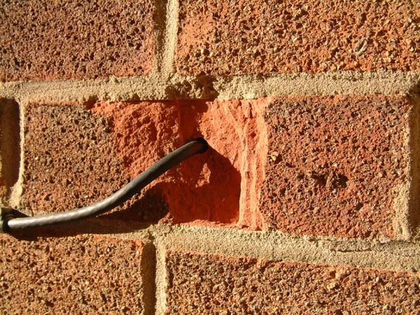 Holes through walls should be drilled from the outside, though the mortar joint, whenever possible. It’s also a good idea to drill ‘uphill’ a bit, to discourage water from creeping in. But of course sometimes the hole has to be drilled from the inside, for instance when the cable is to enter an existing flush backbox from the rear. In such a case, measure the wall thickness by looking at a window or door opening and then turn the drill’s hammer action off for the last inch or so. If the wall is rendered get someone to hold a thick board or a short batten tightly against the surface to hold it together as the drill comes through. But tell them to mind their fingers!