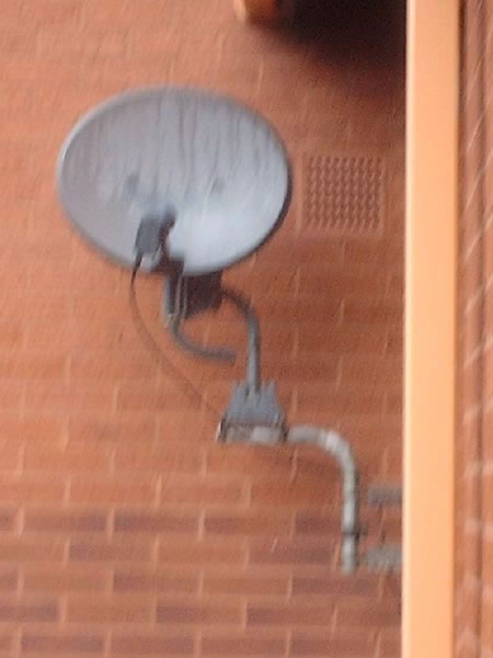 Thanks to Peter Browning of ABC aerials for these shots. As you can see Peter was so convulsed he couldn’t hold the camera still, but it looks as if the installer has re-used an old dish mount and somehow fixed one — or is it two? — ‘L’ masts to it. Needless to say the cable fixing isn’t too good either.