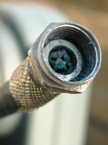 It’s absolutely essential that the connectors on an LNB are waterproofed, and there’s only one way to do it. That’s by the skilled use of self-amalgamating tape, a stretchy product that bonds to itself and seals the connection perfectly. A problem arises here for many installers. Yes, it’s that scary word ‘skilled’. They’ve tried to use self-amalgamating tape and they’ve failed. They just can’t do it — or is it that they can’t be bothered? It takes a few attempts to learn the simple technique and a few minutes to do it each time, and that level of dedication is out of the question for a lot of them. So they use these little rubber slide-on covers, which are quick, easy, and totally useless for keeping the rain out. The result is a cable full of water and a scrap LNB. Can you see the green gunge? That was once the copper inner conductor.