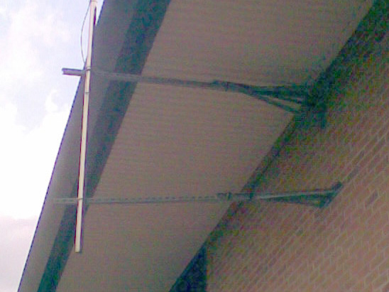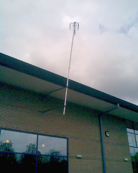 Although the image quality is poor you should be able to see that the arms of the wall brackets have been extended to an almost unfeasible reach by means of Dexion or some similar product. The leverage exerted by the wind on this arrangement must be enormous and the installation will surely have a short life. Let’s hope that the collateral damage isn’t too great when the inevitable happens. That’s a nice big window isn’t it? I’m guessing that the TV system was included in the electricians’ work when the place was built, and they allowed a nominal sum for it without making a proper assessment of what would be needed. Then, when they saw the roof overhang, they decided to improvise on a minimal-cost basis. So what should they have done? One option would have been to get a proper wallbracket set made to order. Another would be to explore other fixing options. Ideally the aerial should have been up on top of the roof. This would look much better because the aerial would only need to be on a short mast and could be a long way from the edge of the roof. In a new-build project it’s often possible to make the client and architect understand the situation, and sometimes an upstand can be fixed through the roof and flashed in as part of the main contractor’s work. It’s certainly worth asking before embarking on an ugly wall mounted job. An example of this type of fixing can be seen here. If the client isn’t keen on having a mast fitted through the roof, there is an alternative, as shown here.