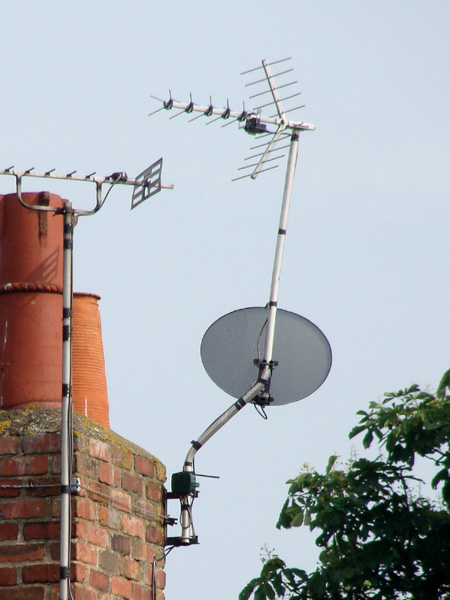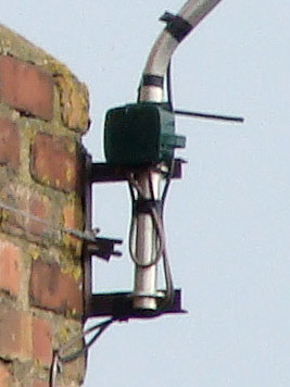 When the wind blows squarely onto the dish the twisting force on the ‘U’ bolts in the chimney bracket will be severe. Constantly repeated tugs and twists from gusting wind will eventually cause the bolts to lose their grip, and the whole thing will turn slightly. The lower ‘U’ bolt can’t be at correct tightness because there isn’t sufficient protruding mast.